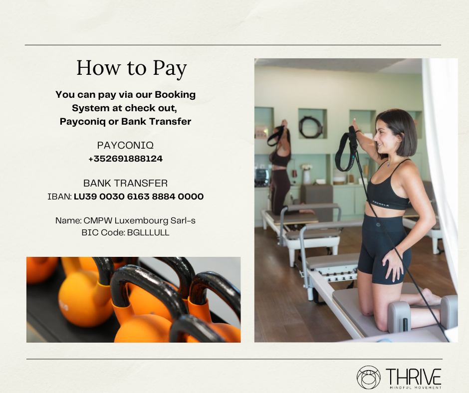 At Thrive Studio Luxembourg, we totally understand that plans can change. To help keep things running smoothly for everyone, we ask that group classes be canceled at least 12 hours in advance and private or duo sessions at least 24 hours ahead.